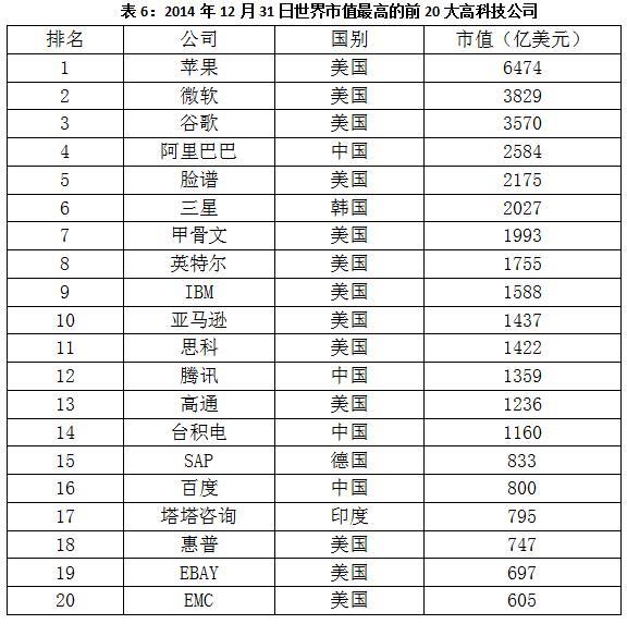 (3)選取各國上市公司市值較高的企業(yè)進(jìn)行案例對(duì)比,可以看出美國企業(yè)以谷歌為代表的科技實(shí)力遙遙領(lǐng)先,其次是中國的百度等公司。