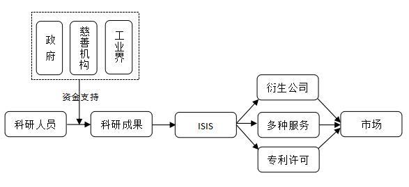 牛津模式主要是在政府、慈善機(jī)構(gòu)和工業(yè)界的資金支持下,牛津大學(xué)的研究人員將創(chuàng)造的科技成果經(jīng)過ISIS的管理和運(yùn)作后,最終通過衍生公司、技術(shù)和市場(chǎng)咨詢服務(wù)、專利許可等形式將其推向市場(chǎng),同時(shí),ISIS根據(jù)市場(chǎng)的需求對(duì)成果進(jìn)行資助或?yàn)檠芯咳藛T提供市場(chǎng)需求信息,最終促進(jìn)科技成果的商業(yè)化發(fā)展。