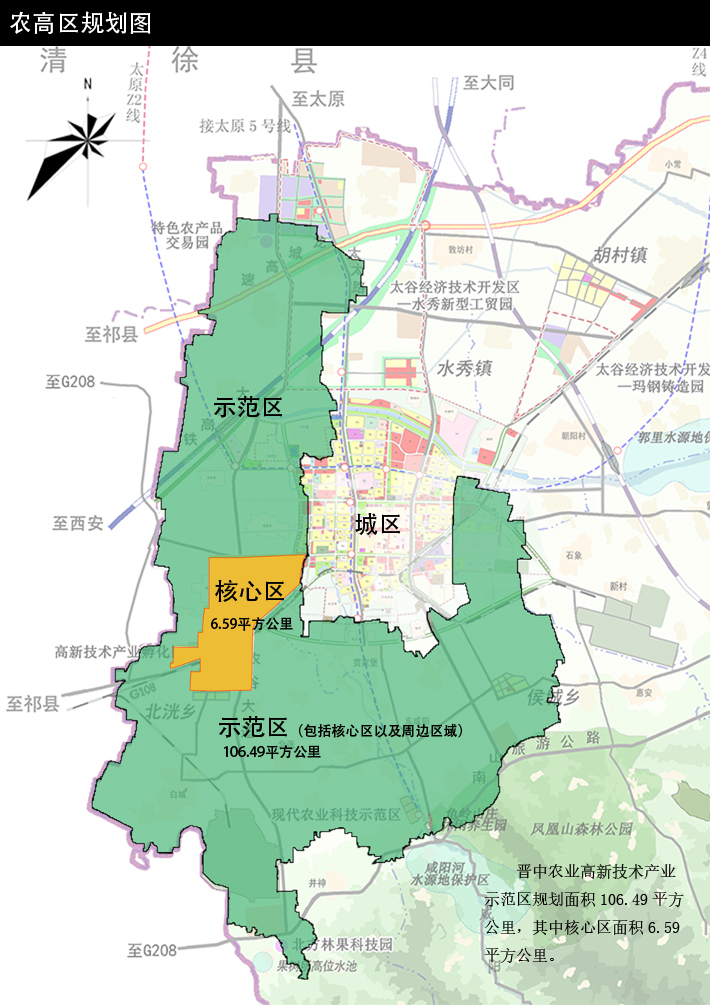 晉中農(nóng)高區(qū)核心區(qū)位于農(nóng)高區(qū)西部,北至箕城街,東至108國道、北洸村東,南至南洸村北部,西至北洸村東、曹莊村東。規(guī)劃面積為6.59平方公里。
