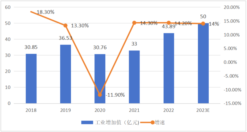 圖表1:2018-2023年江陵縣工業(yè)增加值及增速變化
