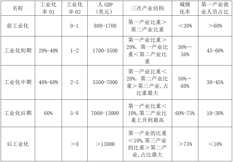 工業(yè)化進程一般分為前工業(yè)化、工業(yè)化初期、工業(yè)化中期、工業(yè)化后期和后工業(yè)化五大階段,根據(jù)國際通行的研究成果,主要判斷指標有工業(yè)化率、人均GDP、三次產(chǎn)業(yè)結構、城鎮(zhèn)化率、就業(yè)人口結構等標準。