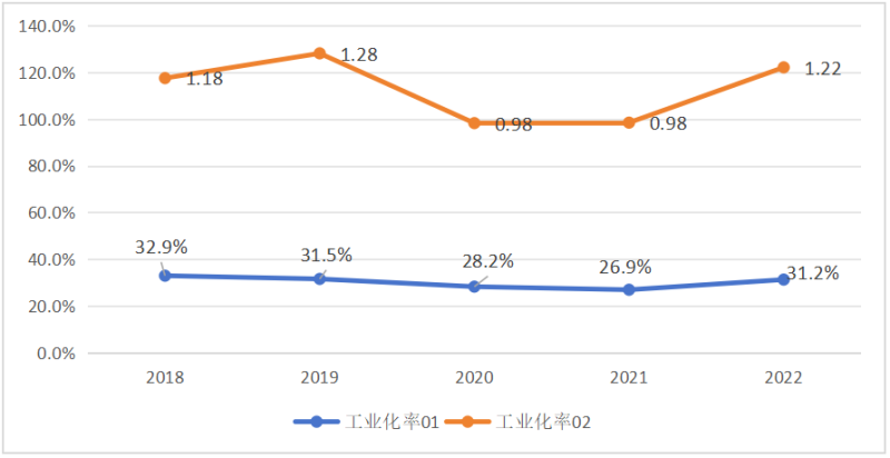 從工業(yè)化率來看,有兩種計算方法:工業(yè)化率(01)=工業(yè)增加值占地區(qū)生產(chǎn)總值比重,工業(yè)化率(02)=工業(yè)增加值與農(nóng)業(yè)增加值的比值。2020年以來江陵縣工業(yè)增加值保持兩位數(shù)快速增長,2022年工業(yè)增加值占地區(qū)生產(chǎn)總值比重為31.2%,工業(yè)增加值與農(nóng)業(yè)增加值的比值為1.22,處于工業(yè)化初期階段。
