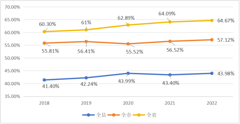 從城鎮(zhèn)化率來看,2018-2020年,江陵縣城鎮(zhèn)化率保持較快增長,2020年以后城鎮(zhèn)化率發(fā)展趨于緩慢,維持在44%水平,處于工業(yè)化初期階段。江陵縣城鎮(zhèn)化率遠遠低于全市、全省水平,城鎮(zhèn)化進程較為滯后,仍有較大提升空間。